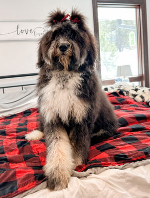 Brenda is an F1 bernadoodle who was born in June of 2022. Her average weight is around 65-70 lbs and she could not be a better mother. Brenda is the most gentle, calm dog we have ever owned. She has beautiful coloring that she has shared with her offspring. You couldn't ask for a better dam. This little lady is very loved.